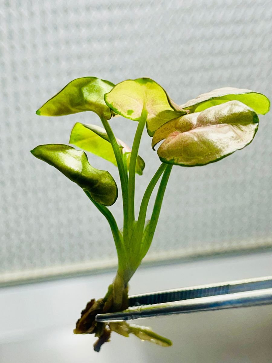 Syngonium ‘Strawberry Milk’ is a beautiful ornamental plant featuring soft green leaves with gentle pink and creamy variegation, admired for its delicate color blend and elegant indoor appeal.