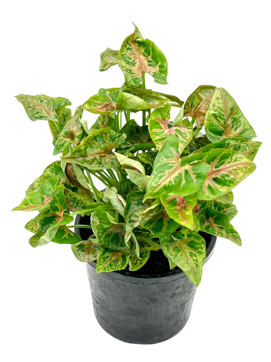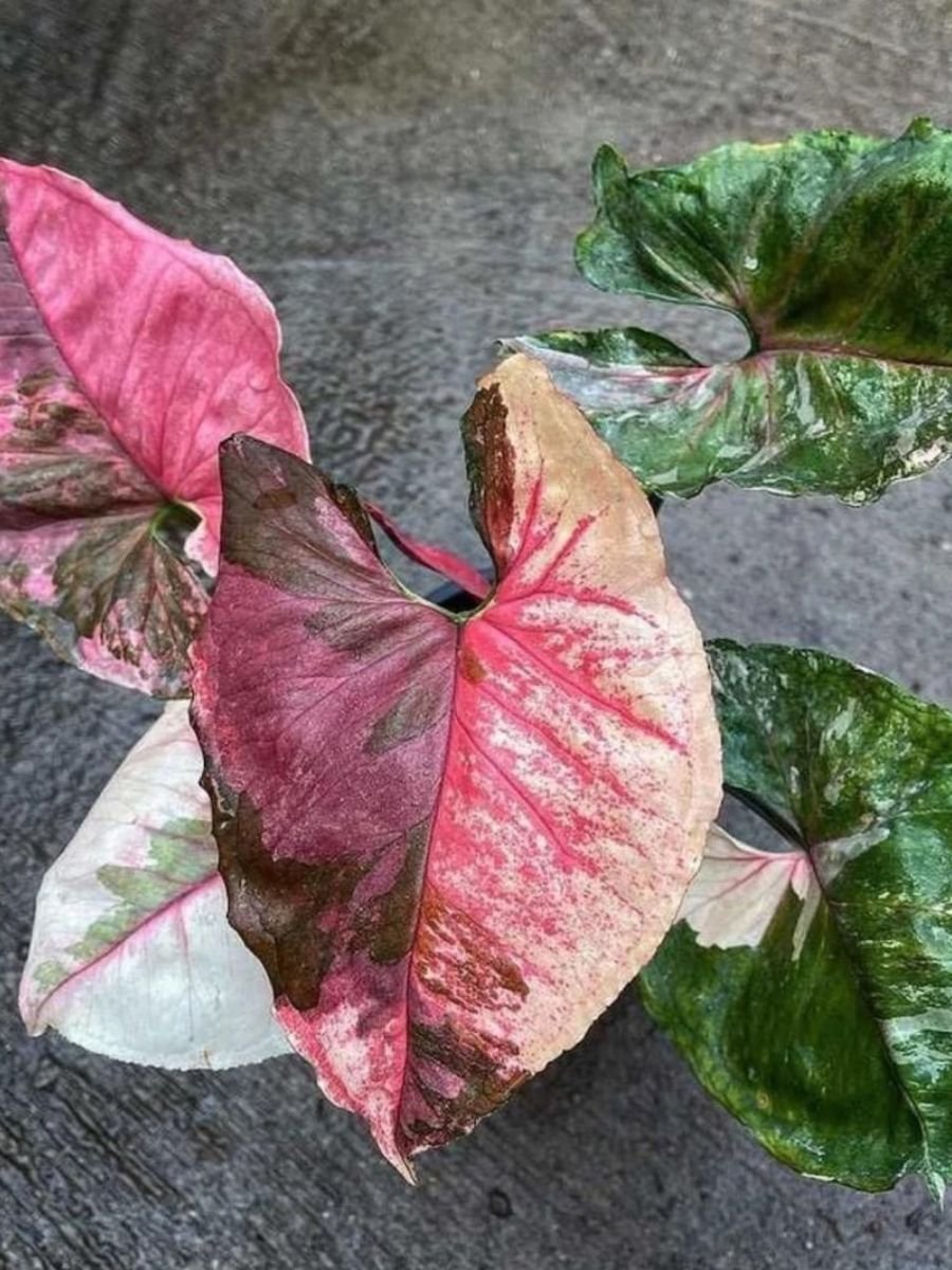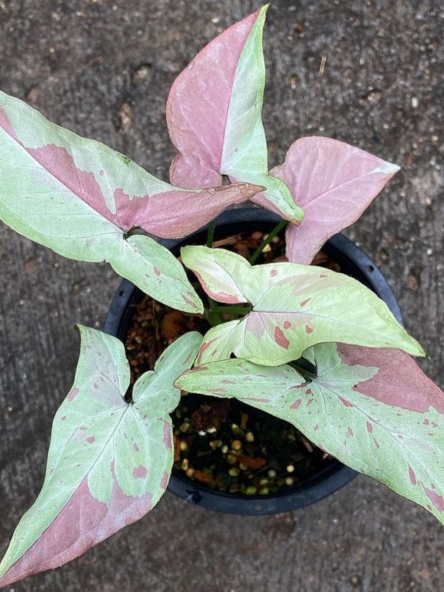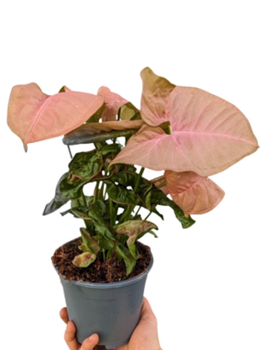 Syngonium podophyllum ‘Pink’ is a charming ornamental plant featuring soft pink and green arrow-shaped leaves, admired for its gentle coloration and attractive indoor display.