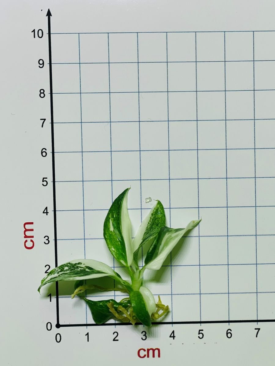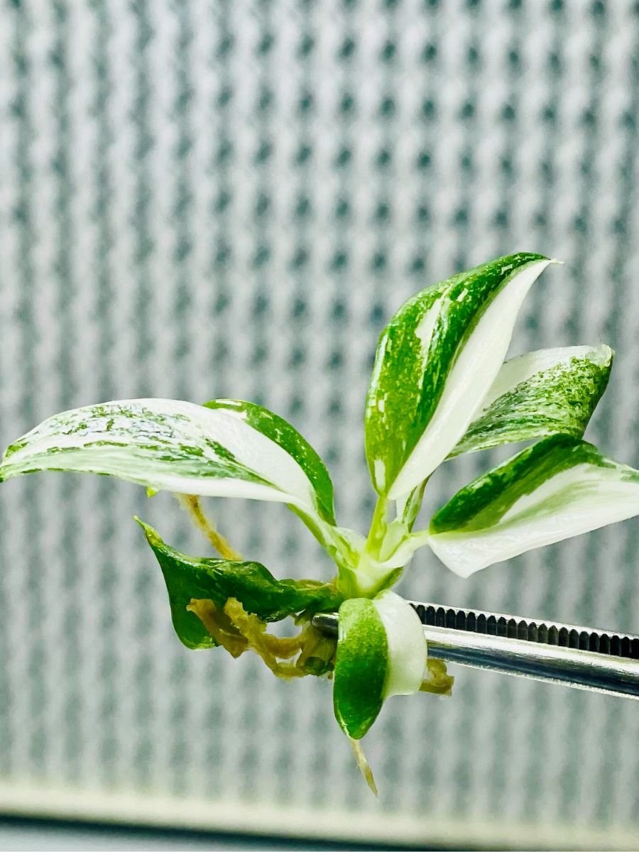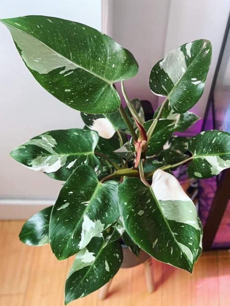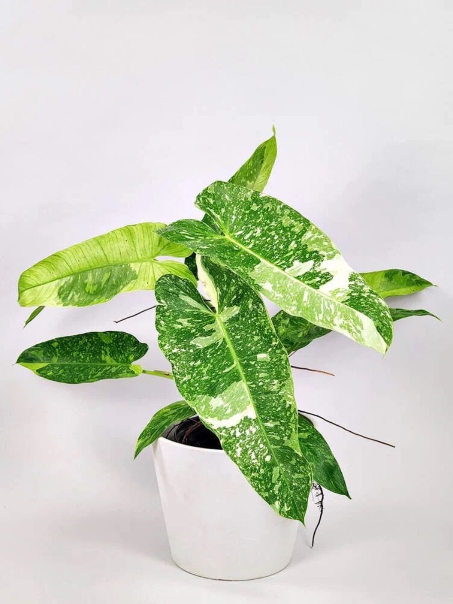 Philodendron White Wizard is a striking ornamental plant with large green leaves accented by bold white variegation, valued for its clean contrast and elegant tropical appearance.
