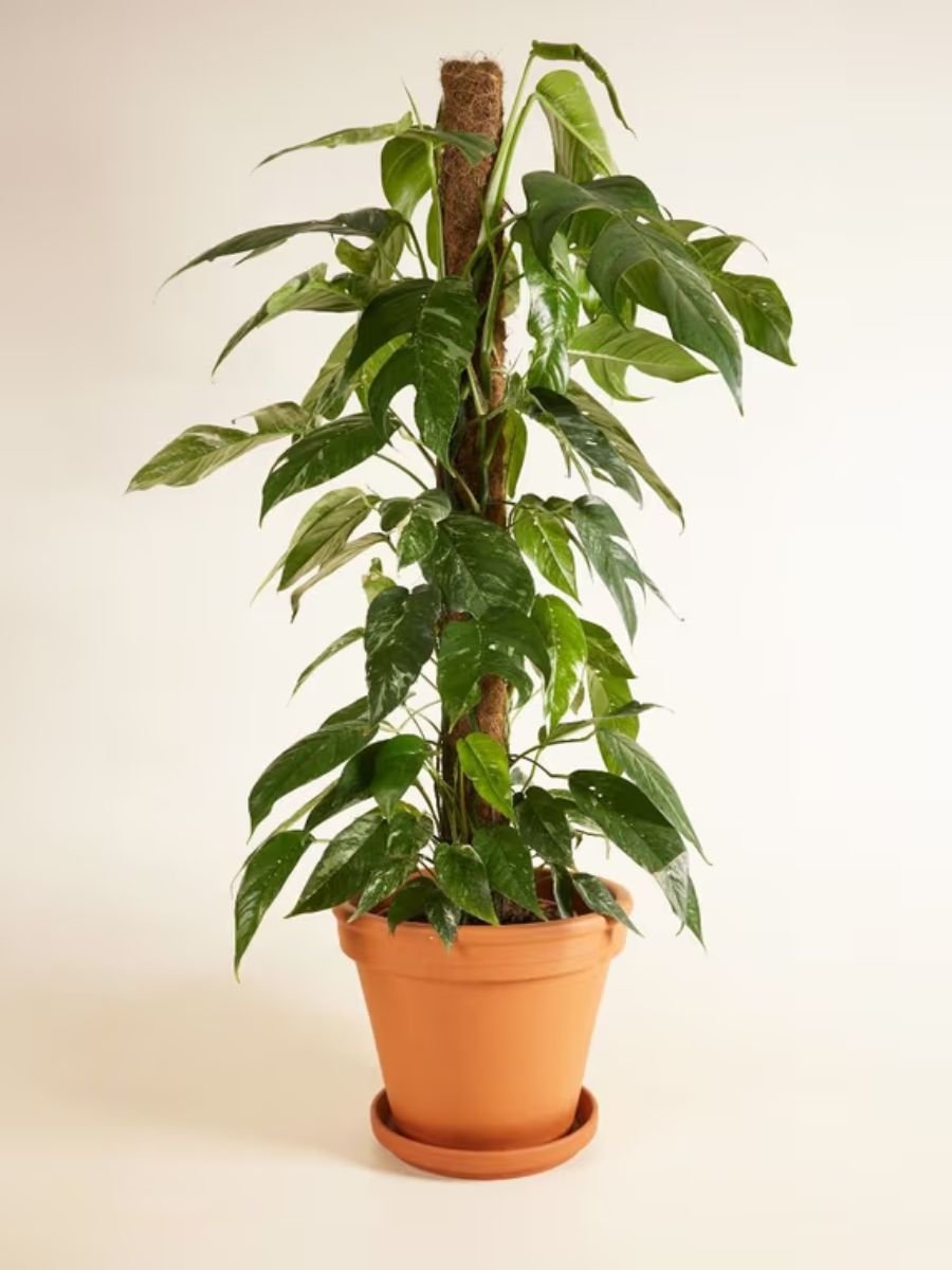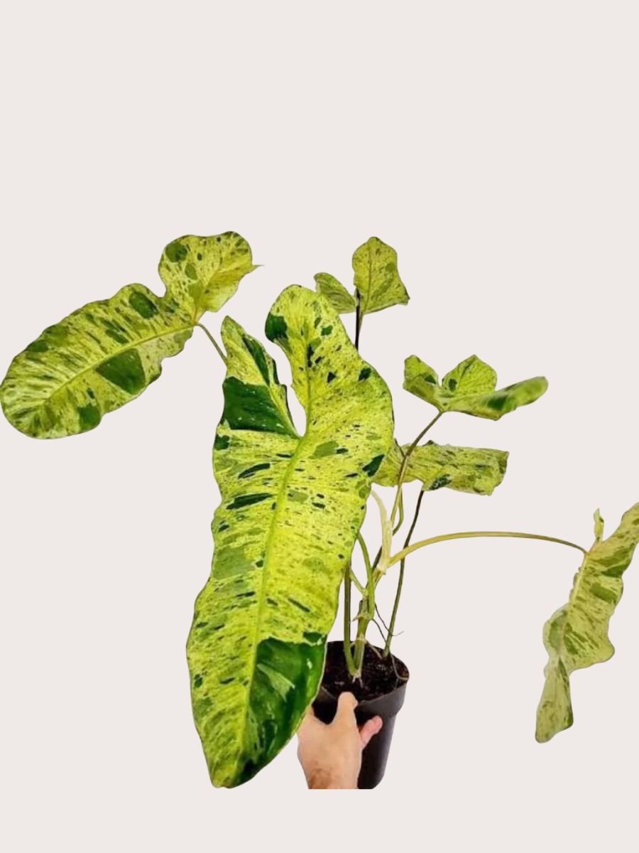 Philodendron Joe’s Buono is a rare climbing ornamental plant known for its large green leaves with striking cream to white variegation, prized for its bold foliage and exotic appeal.