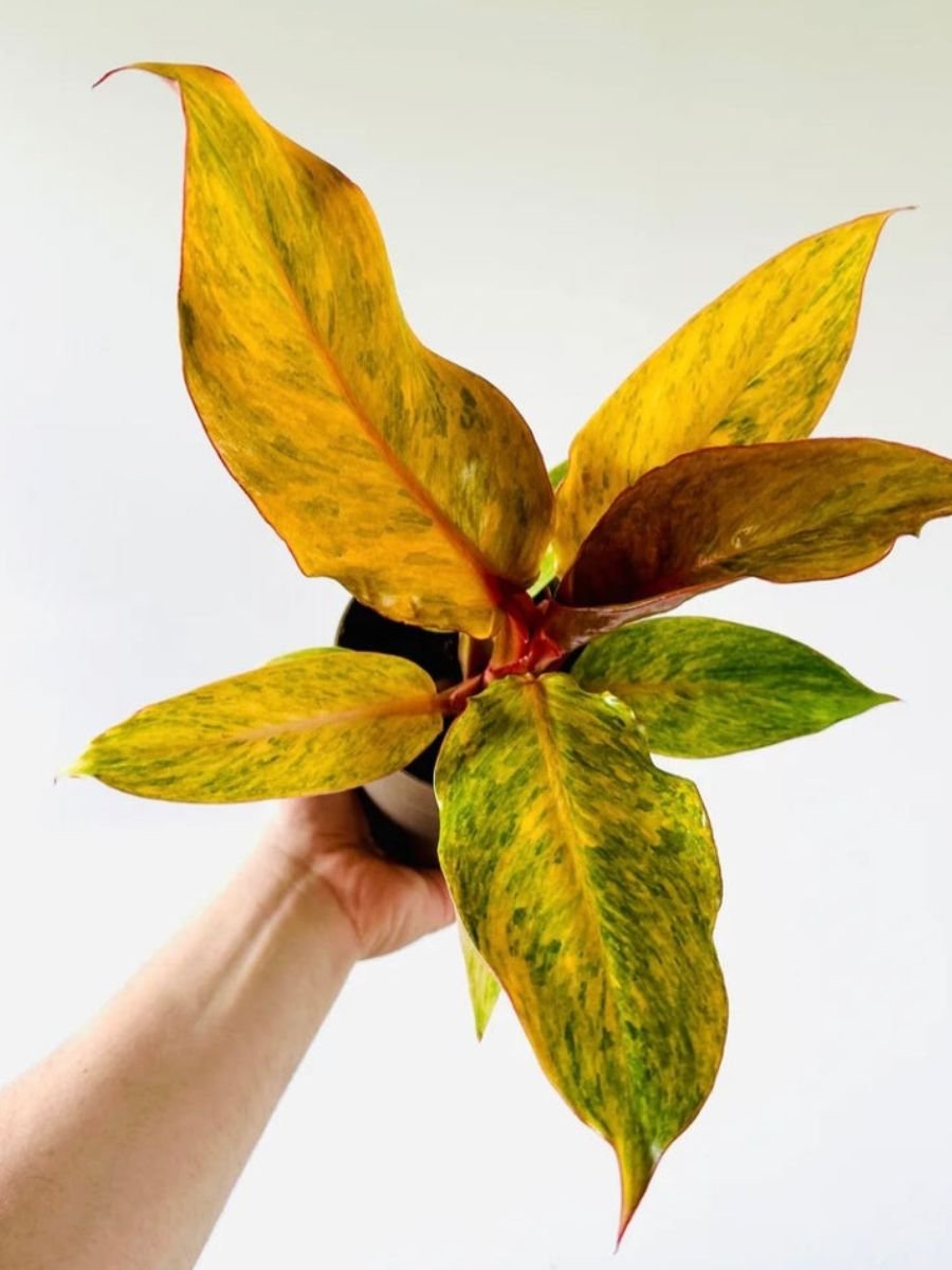 Philodendron Orange Marmalade is a vibrant ornamental plant featuring bold green leaves splashed with bright orange and yellow variegation, admired for its energetic color and tropical appeal.