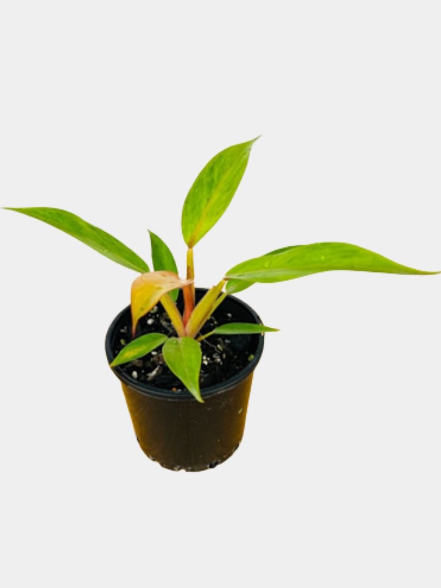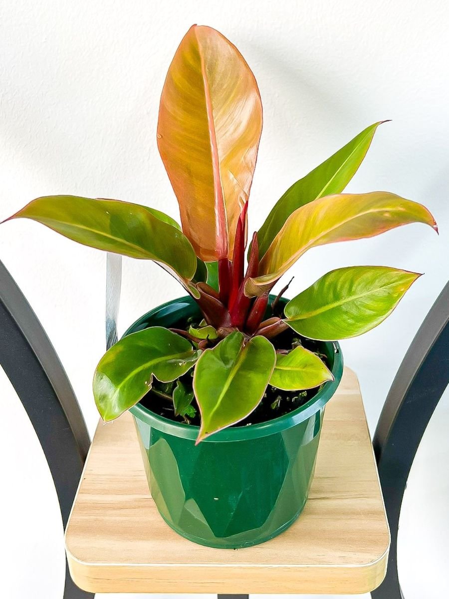 Philodendron Sunshine Red is an eye-catching ornamental plant featuring vibrant red to copper-toned new growth that matures into rich green foliage, admired for its colorful, tropical appeal.